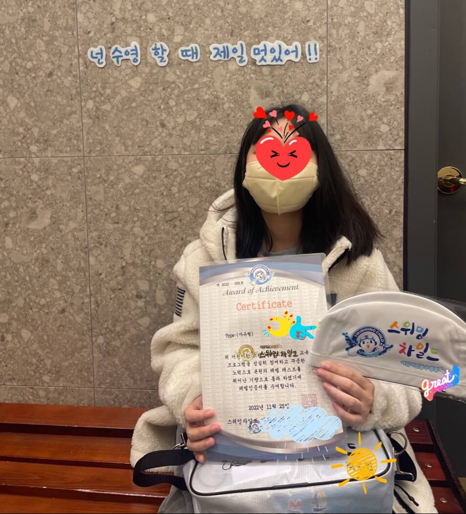 학원을 많이 다니는 아이들의 쳇바퀴 돌듯 힘들어하는 것을 보면서도 걱정이 커가는 즈음 지구마다 스위밍 차일드라는 좋은 시설이 있는 것을 알게 됐어요. 가까이는 올케가 아이 둘을 보내고 있었고, 코로나19가 막 터진 이후에도 계속 보내면서 어언 2년간 훈련받았다고 해서 동영상을 우연히 보게 됩니다. 너무 멋진 조카들. 반했어요. 우리 아이들도 보내고 싶어서 기회를 기다리고 있었죠. 금액이 좀 있는 관계로 돈을 준비해야 했고, 마침 동네도 돌아다니는 학원차를 보게 되어 전화번호를 저장해 뒀죠. 그런데 초등생만 받더라고요. 더 안전하게 생각됐어요. 그리고 마침 광주 상생카드 특별할인 행사 기간이라 1인 5만 원을 할인받을 수 있었죠. 좋은 기회를 꼭 잡고 싶어서 아이에게 1-2달가량 학원에 대해 설명해 주고 허락을 받고 함께 학원에 갑니다. 실내 1층에 위치해 있고 외부에서 통창을 통해 아이들 훈련받는 모습을 안전하게 지켜볼 수 있게 시설이 돼있었어요. 홀 안에 5개 라인으로 구성돼 있어 각 라인별 한 선생님이 지도하며, 아이들은 4-5명씩 구성돼 있어 더욱 신뢰가 갔습니다. 아이는 그래도 두려움이 있었지만 달래가면서 생존수영 꼭 배워야 한다고 설득하며 보냈어요. 잘 다니다가 중간에 안 되는지 울길래 여러 얘기를 해보니 머리가 자꾸 물속으로 빠져서 힘들어했던 것을 나중에 알게 돼 좀 속상하더라고요. 하지만 소통을 원활히 해서 열심히 한 덕에 마침내 자유형을 통과했습니다. 멋진 딸!! 아자 아자. 보통의 아이들보다 조금 늦은 감이 있었던 것과 중간에 소통을 잘 못했던 것으로 진도가 조금 늦었지만 더 꼼꼼하게 할 수 있었던 계기였던 것 같아요. 그래서 선생님이 보내주신 영상을 잘 참조하여 소통을 잘해야 될 거 잊지 마세요.