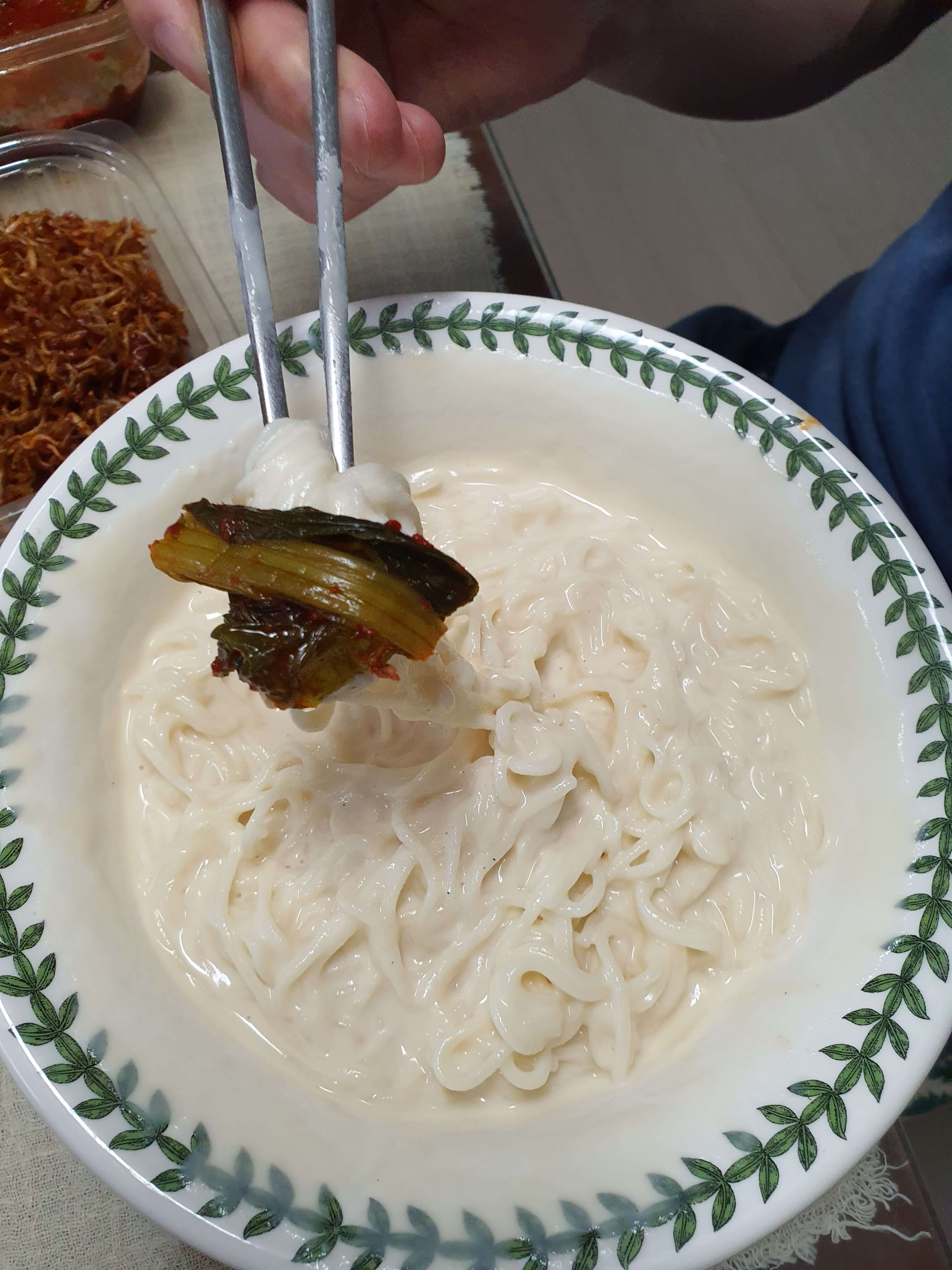 <콩국수> 소면중, 콩물 마트용, 삶은 소면에 갓김치
